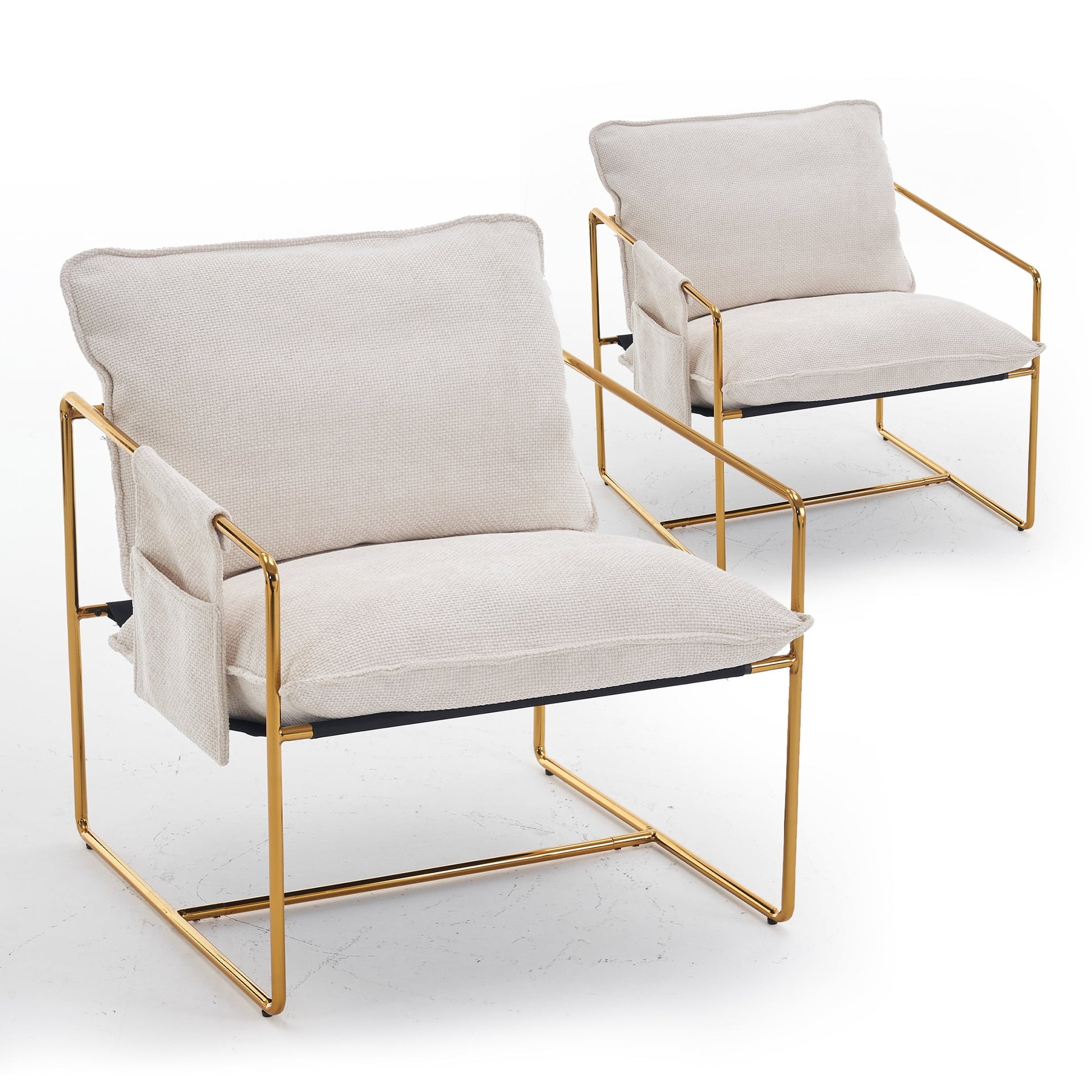 Add a touch of modern comfort to your home with Aukfa AK-FDC2-021 set of 2 upholstered sling accent chairs. Featuring a sturdy metal frame, gold-plated finish, crushed foam cushions, and skin-friendly woven fabric, these chairs are perfect for the living room, bedroom, reading nook, or home office. The convenient arm pocket offers added functionality and style.