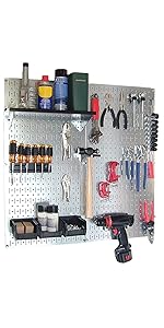 Wall Control's Metal Pegboard panels accept all of Wall Control's patented slotted pegboard hooks, brackets, and shelving assemblies. Wall Control's patented pegboard system does not limit you to one proprietary set of pegboard accessories but instead offers many options. It is true, Wall Control's proprietary slotted system does out perform all other conventional pegboard peg systems but if you just love those little round pegs, feel free to use them. However, if you want to upgrade to Wall Control's First-in-Class Slotted Hook Accessory System then your panels will be ready when you are. You can upgrade all at once or one hook and panel at a time as your budget and needs dictate. That is the beauty of the Wall Control Pegboard Storage System. This Pegboard Basic Tool Organizer Kit includes an assortment of Wall Control Slotted Pegboard Accessories.